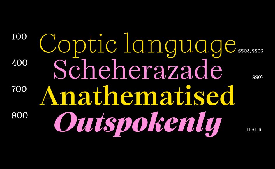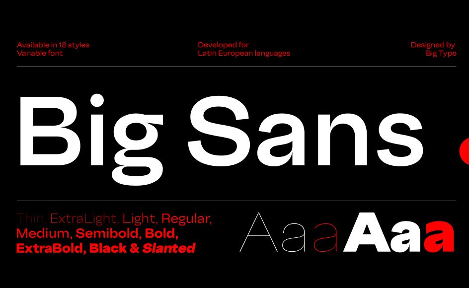 This dual nature makes it extremely rare. Big Sans comes in 9 weights from Thin to Black, each with matching slant styles to effortlessly handle everything from dense footer text to punchy cover lines. Designed by Karol Mularczyk and released in 2025, this is a workhorse with an interesting inner life.