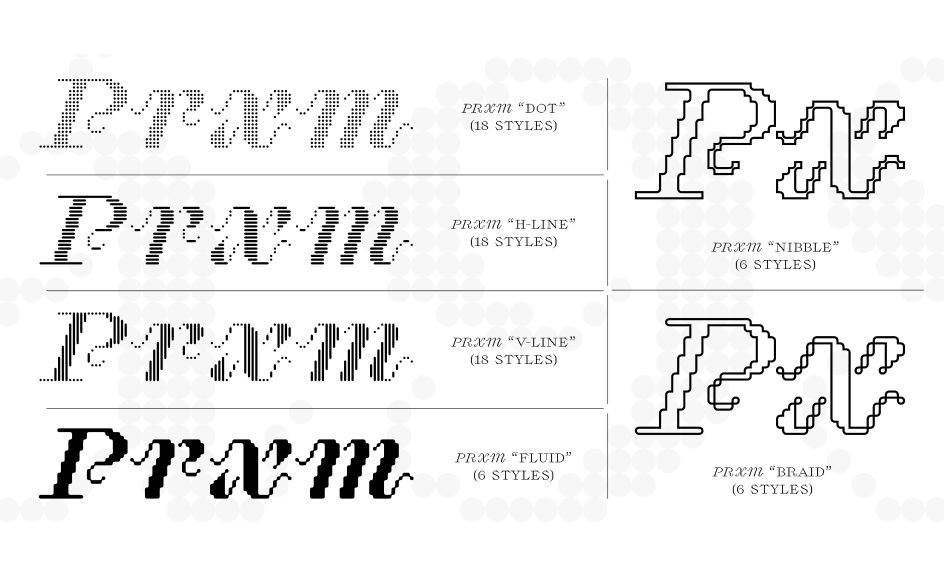 Proximity has an unusually compelling origin story. Originally a bespoke italic for PROXIMA, a Barcelona-based creative studio working on live music, its conceptual roots show through. The basic idea is that of a pixel grid: individual elements, when connected, form something greater than the sum of their parts. From this starting point, the system further expanded into six sub-collections, including fluid continuous shapes and expressive silhouette styles.