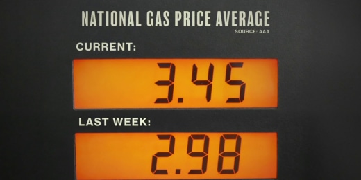 The national average for gas prices is now $3.45, up 47 cents from a week ago. But a rise in oil prices can affect more than just the cost at the pump. The cost of food, transport and production may also increase. NBC News’ Ally Canal reports.