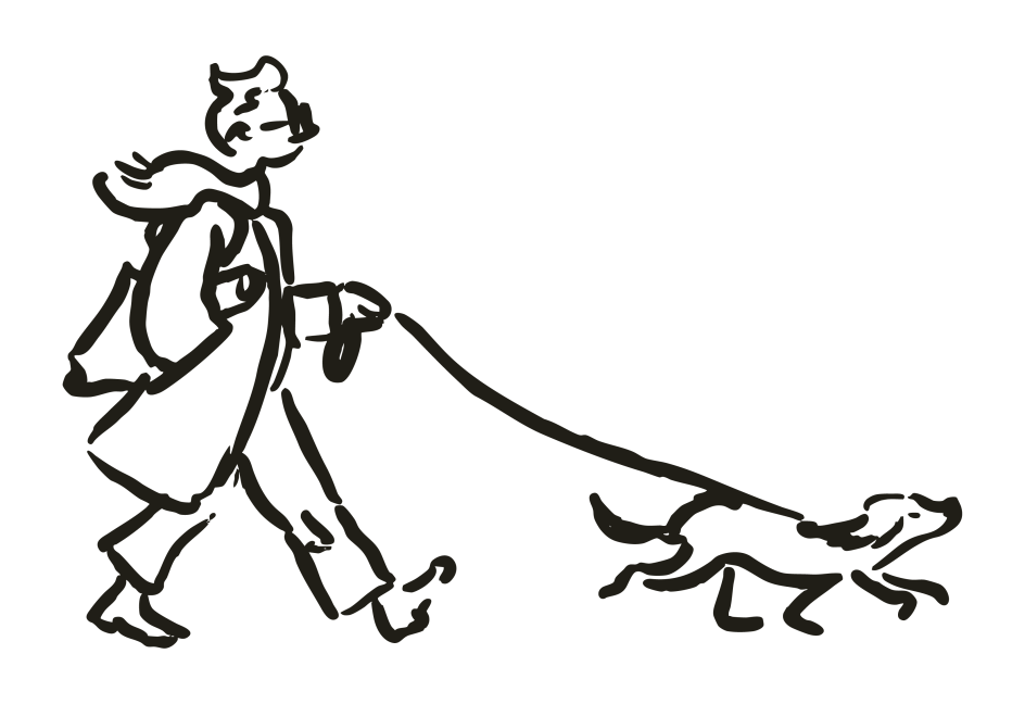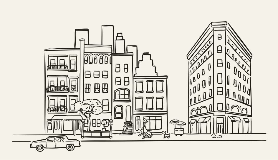 The illustrations feature the founder’s own pets and the dogs of Crown team members. They appear in movement (strutting, sitting, stretching) and are presented in economical lines that somehow convey unique character and variety without falling into caricature. Site-specific drawings position the brand within its immediate neighborhood, referencing West 25th Street and wider New York landmarks.