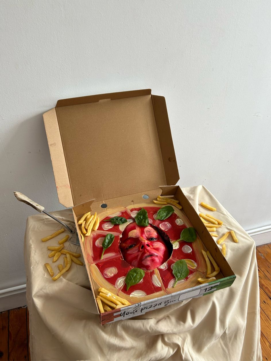 The show was filmed in an old flat in Dalston where she lived a few years ago and shows Maya’s head poking out of a pizza box. The pizza itself is painted but the basil and chips look very real. There’s a bolognese sculpture so big she could sit in the pan while it sizzles and oozes on the floor; a fish head cut out of paper, served with salad leaves, tomatoes and lemon; a pastel-colored cupcake made of ruffles with Maya’s head shaped like a cherry; and a juicy-looking cocktail with a cutout in the middle perfect for Maya to take a sip from. Everything is made of paper.