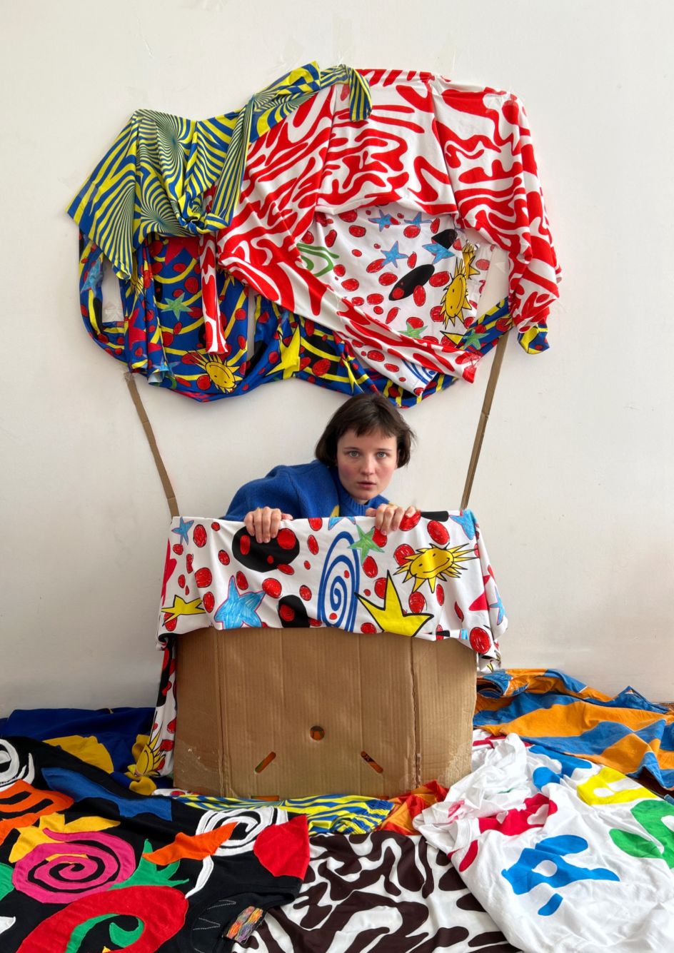 There are a variety of media in her portfolio, from digital prints of her face to window displays to large cardboard sculptures that she can sit in. One of the standout pieces is her collaboration with Ed Curtis, a London-based artist and designer known for his hand-drawn “wearable art,” often featuring bold smiley faces and luxurious color palettes. A long-time admirer of his work, Maya was excited about the opportunity and immediately jumped into meetings to develop the concept.