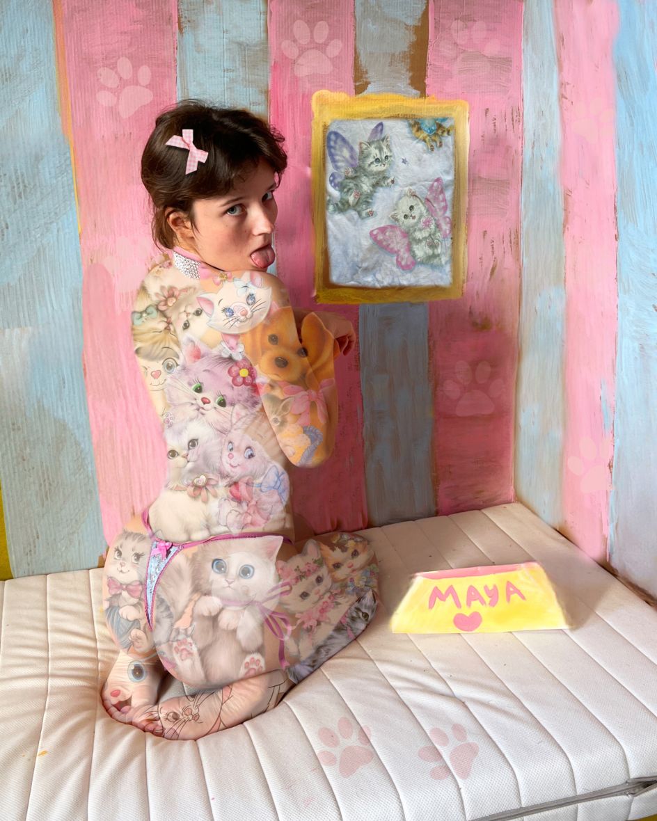 Maya was born in Moscow and knew from an early age that she was creative. She entered children’s art school around the age of 12 and later worked as a painter, photographer and sculptor – “always looking for something new,” she said. When lockdown happened and she found herself stuck at home, she sought a new way to express herself and develop her artistic talents. It all started at the age of 18, and a year later she “exploded” online. At the age of 21, she left her home country for London and began her creative career. Since then, her work has evolved into a playful, joyful performance form of self-portraits.