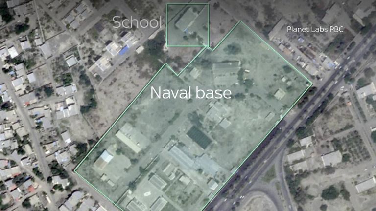 There were three visible strike impact points on buildings at the IRCG base and an impact on a school. Credit: Planet Labs PBC